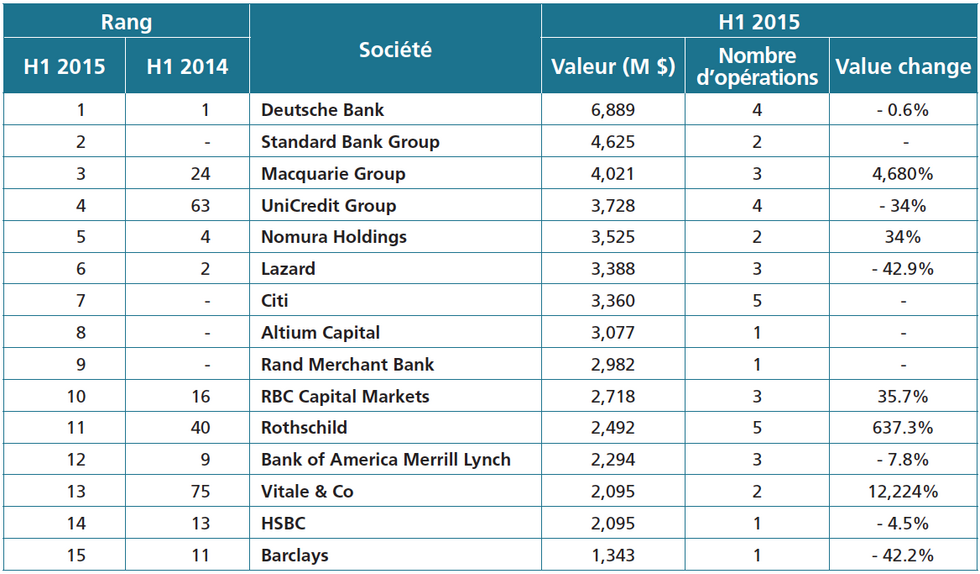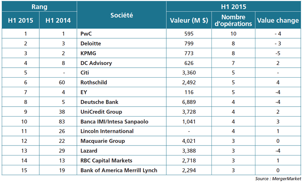 Le classement de MergerMarket est basé sur les deals annoncés au premier semestre, portant sur une cible française, dans lesquels les conseils interviennent côté acheteur pour des opérations dont la valeur est supérieure